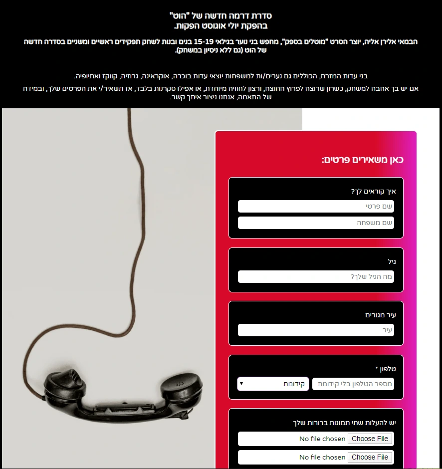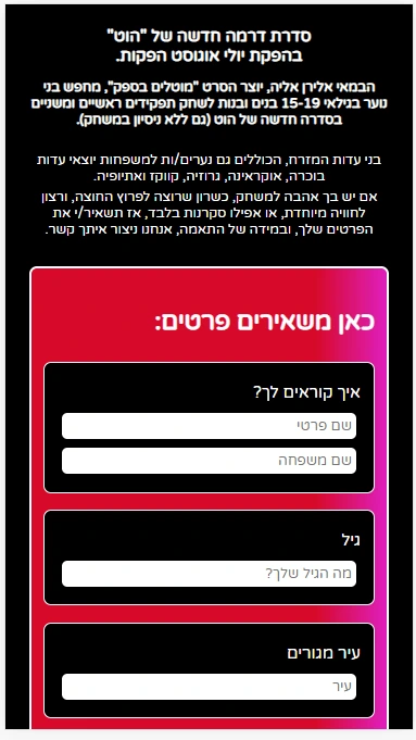 דף נחיתה עם טופס איסוף מועמדים לאודישנים עבור סדרת טלויזיה.